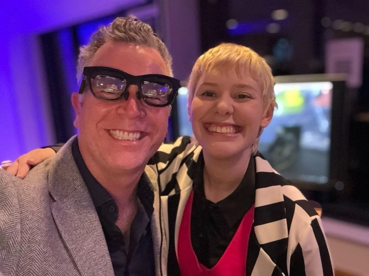 Marketing Executive Ceri with fellow attendee Ben Stirling modelling our smart glasses accessible solution